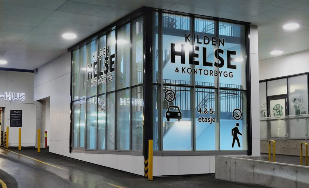 Ved innkjøring til P-huset vil du se et trappehus merket med Kilden helse & kontorbygg (lyseblått område på bilder).